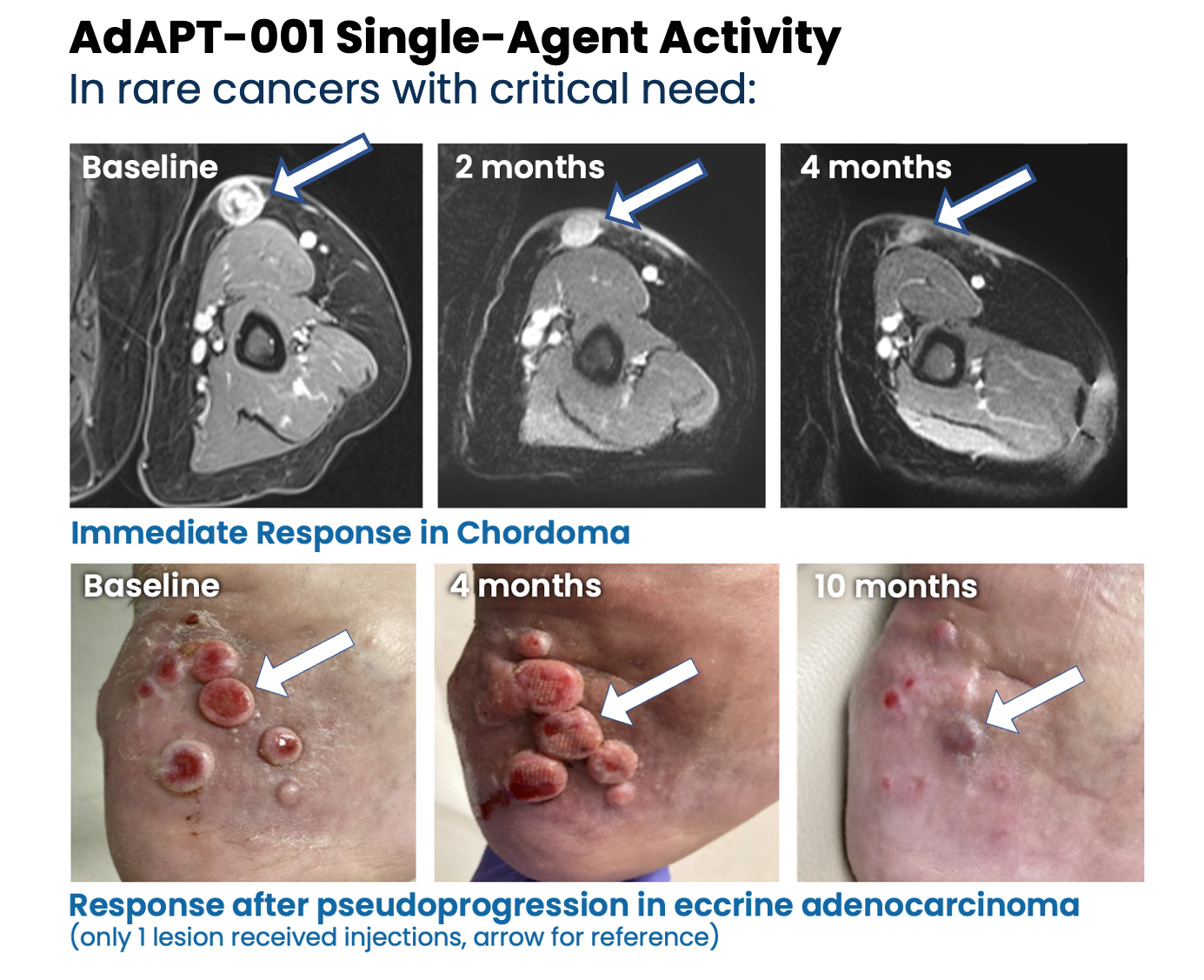In the Phase 1/2 clinical trial called ‘BETA PRIME’ (ClinicalTrials.gov identifier NCT04673942), the safety profile of AdAPT-001 was favorable with no dose limiting toxicities or related serious adverse events (SAEs) both alone and in combination with a checkpoint inhibitor. Also favorable was the demonstration of clinical activity that included several partial responses. One of them involved an angiosarcoma patient with lesions that covered his face. Following treatment with AdAPT-001, most of the lesions clinically regressed, and his before and after images received a lot of attention at the conference.